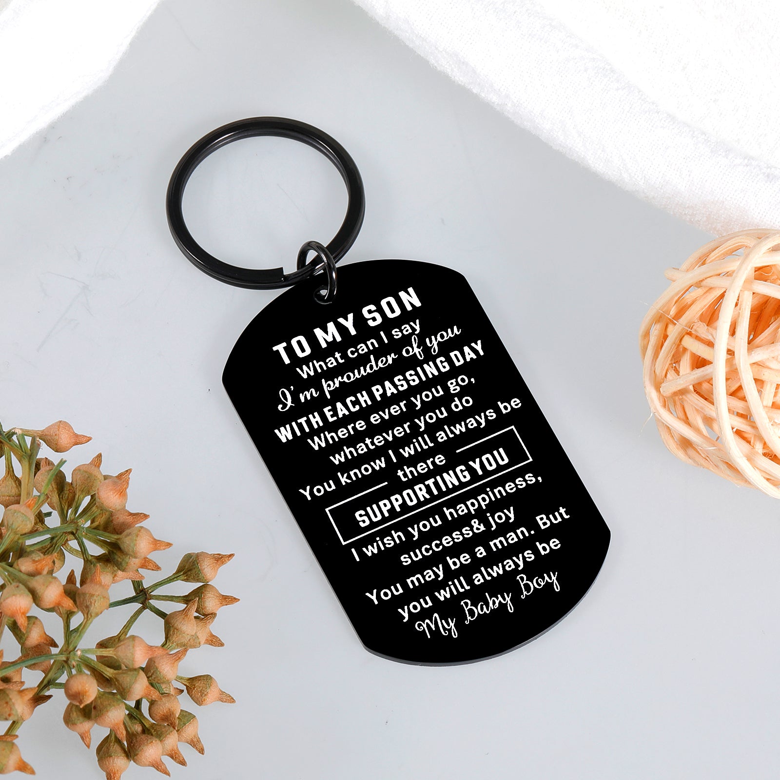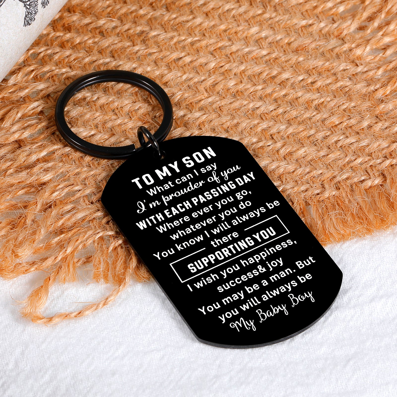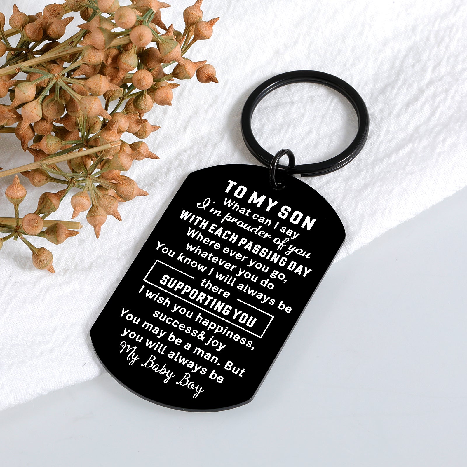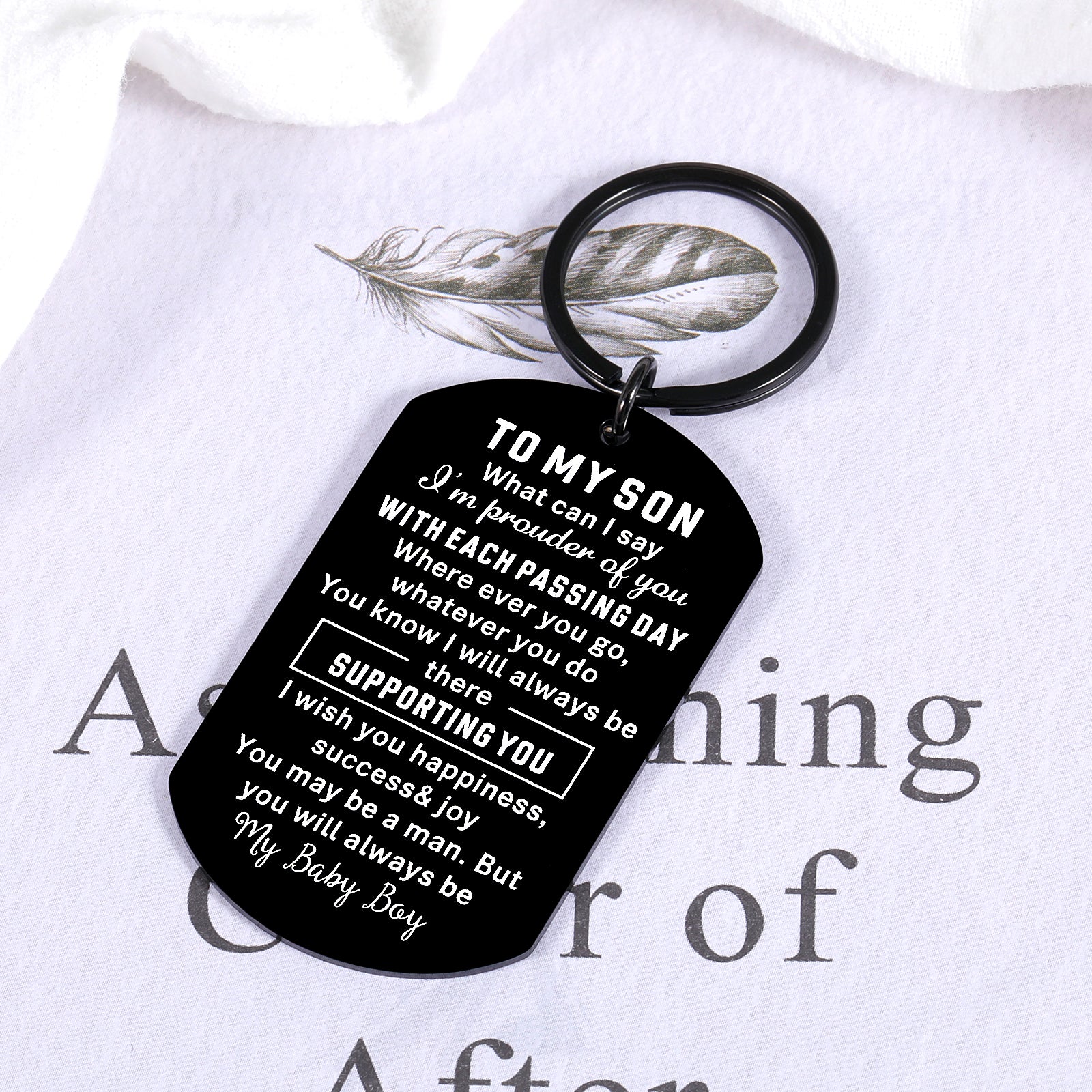 - 【To My Son Inspirational Keychain】: To my son, what can I say I'm prouder of you with each passing day where ever you go,whatever you do you know I will always be there supporting you I wish you happiness,success&joy.You may be a man.But you will always be my baby boy.The words on keychain mean a lot,your son will be touched.This gift is a token of love that he can keep with him as a reminder of how special he is and how much you love him! Great for birthday,graduation,Christmas,Valentine's Day.
