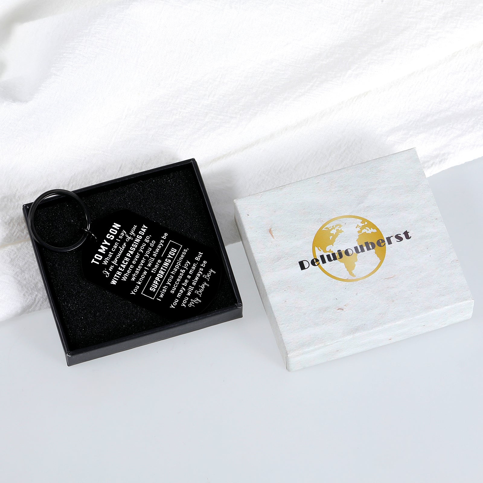 - 【Exquisite Package & Great Service】: 1 x Stainless steel keychain, 1 x exquisite gift box. Measuring 1.3 * 2.2 inches / 33 * 55 mm. Inspirational key chain is a perfect long-term keepsake. Each keychain is carefully crafted and packaged. Perfect encouragement gift for son, stepson, son-in-law to let him know how much you love him. As he gets older, he will face many challenges in life, and you will always support him. If you have any questions about the product, please feel free to contact us.