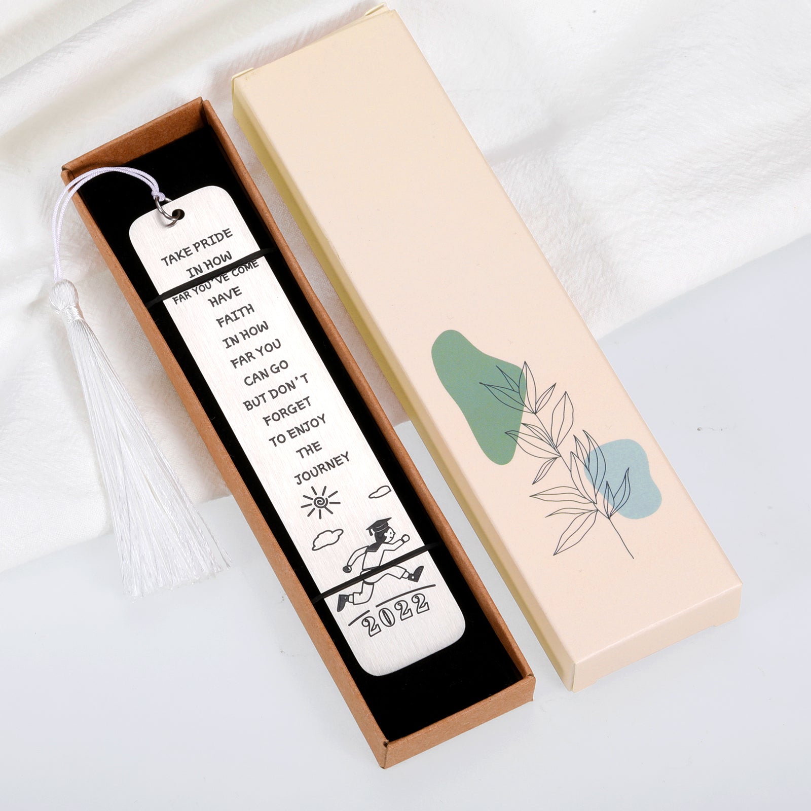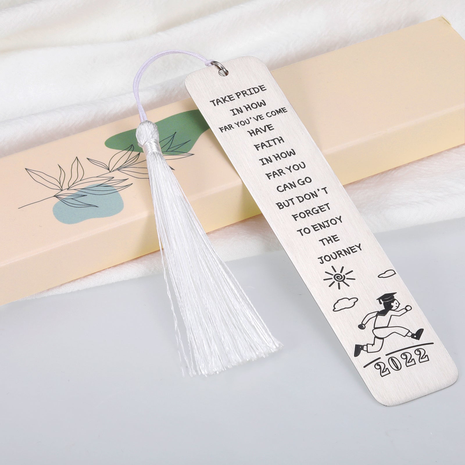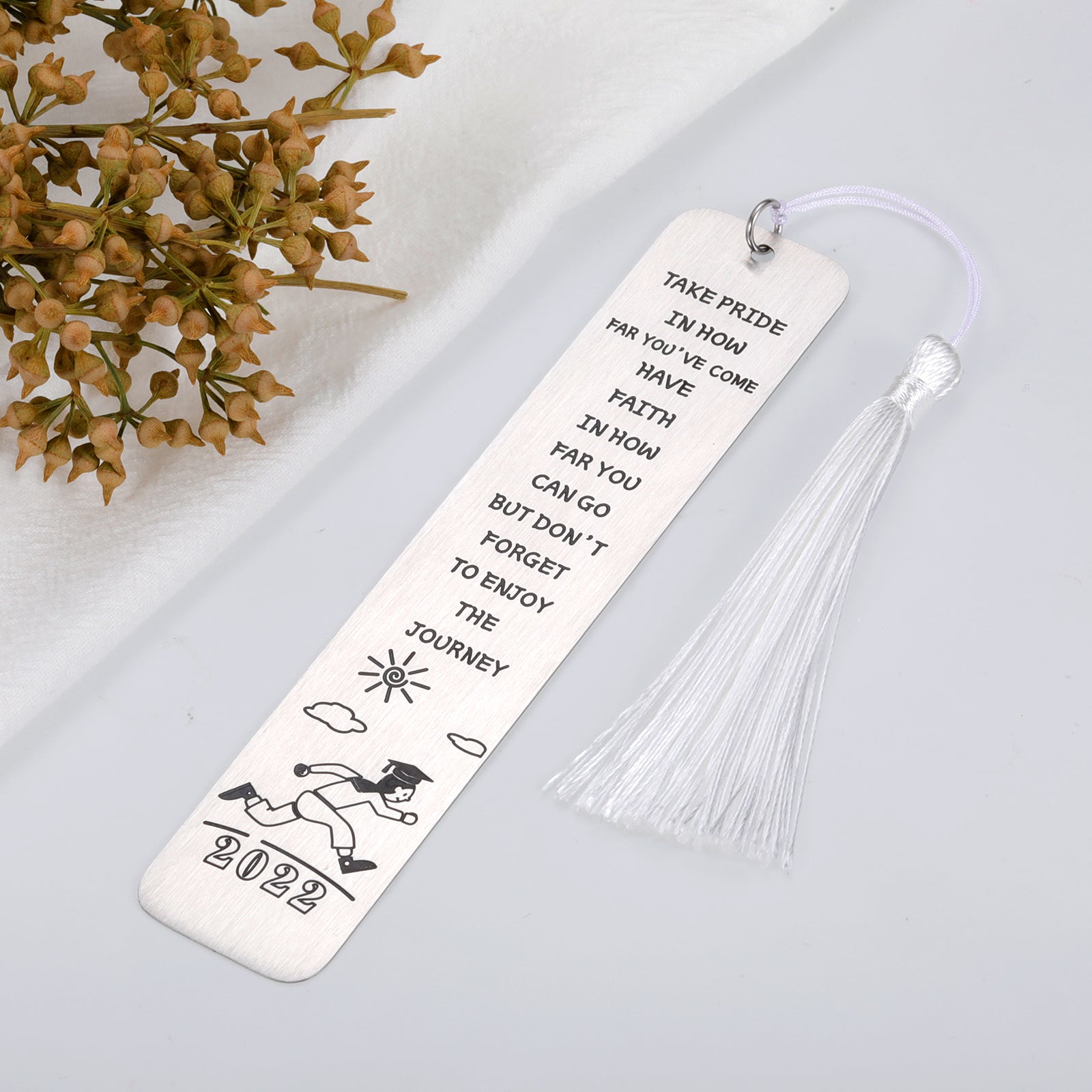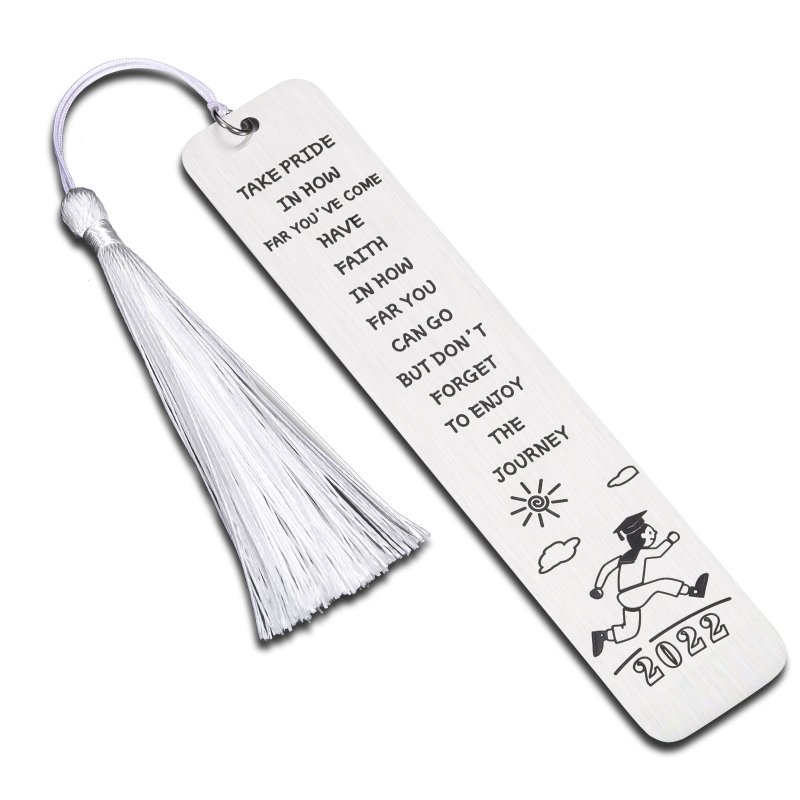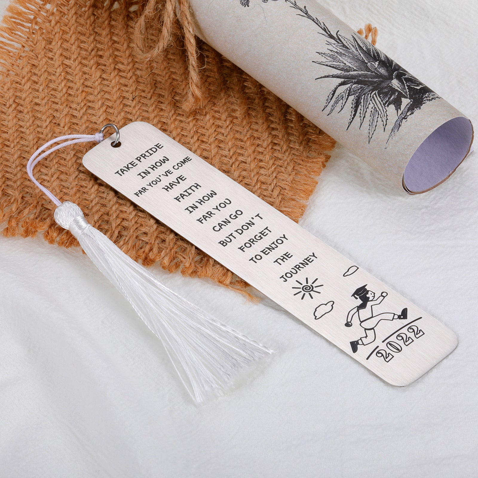 - 🎓Class of 2022 Gifts - Engraved with inspirational messages “Take pride in how far you’ve come. Have faith in how far you can go. But don’t forget to enjoy the journey”. Lettering will be engraved and clearly presented on the surface of this bookmark. This is a well-thought-out gift with initial makes perfect 2022 graduation gifts for a son, daughter, granddaughter, grandson, niece, or nephew and celebrate your loved one’s 2022 graduation from school.