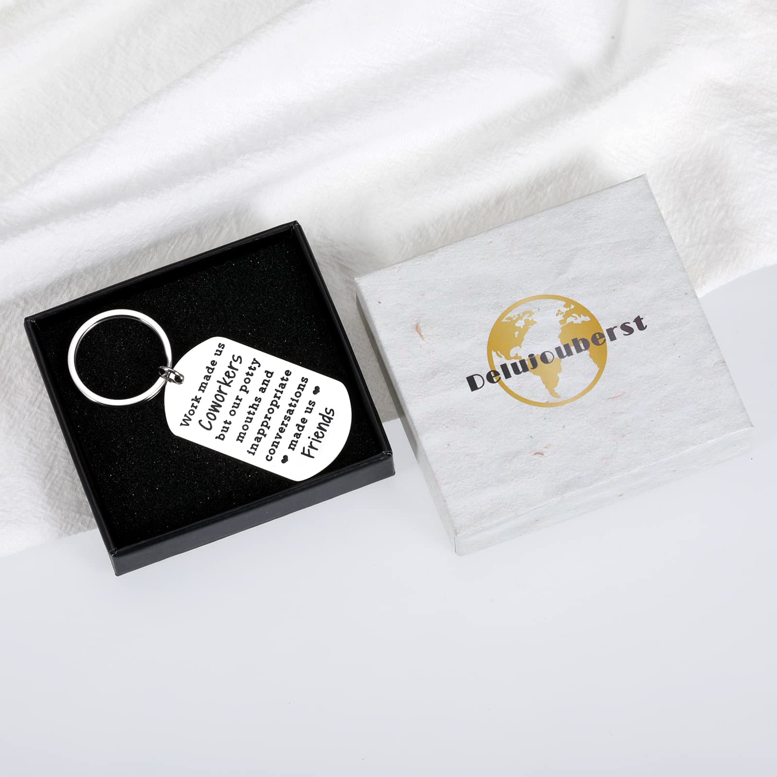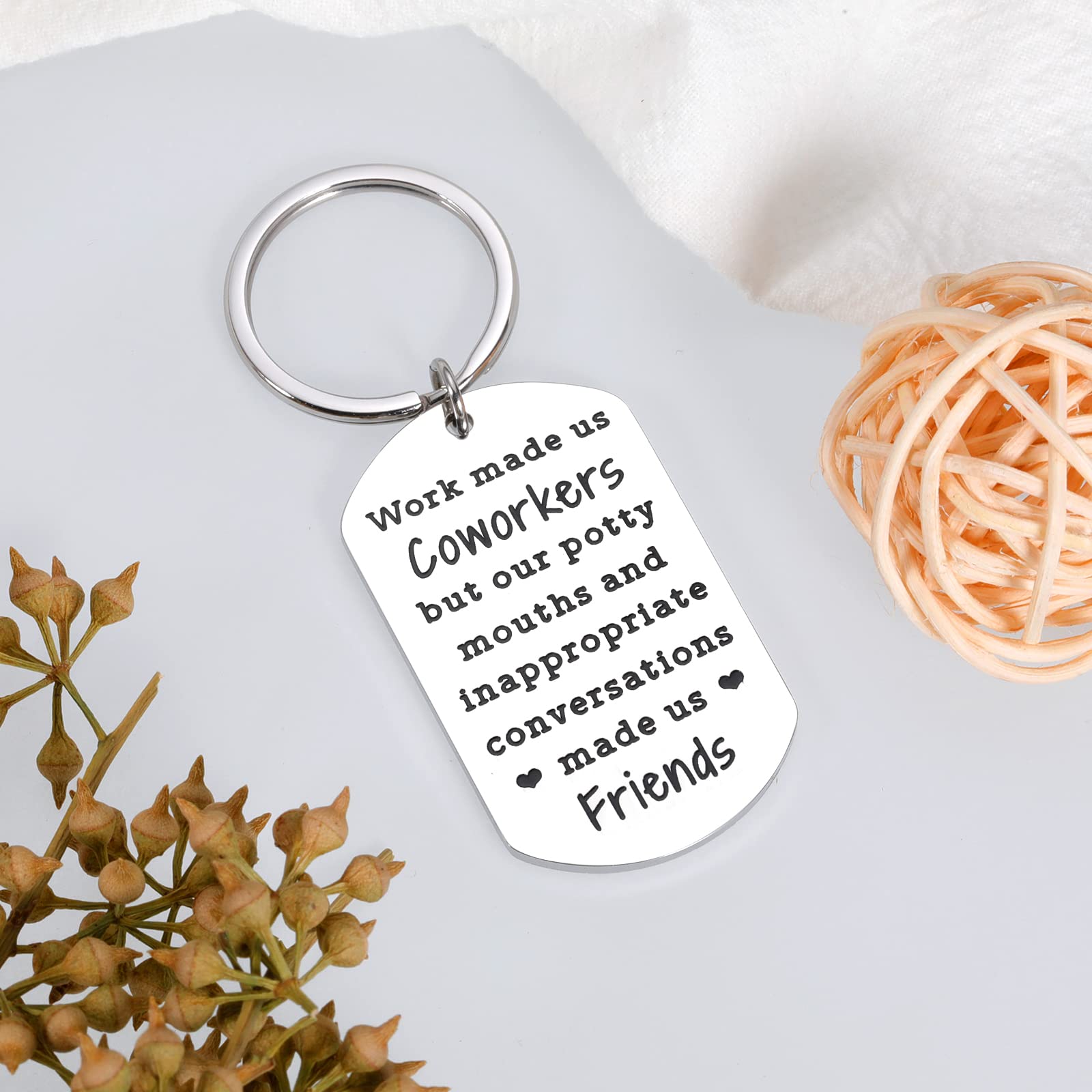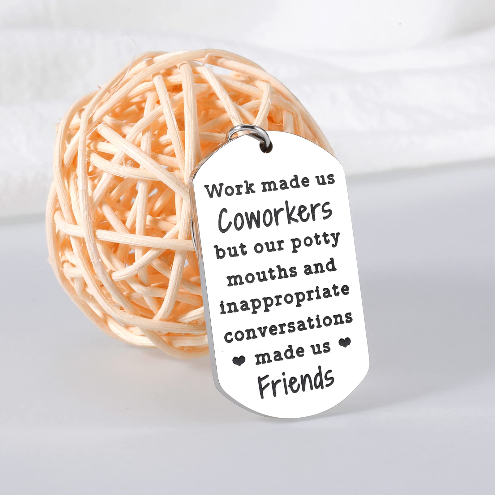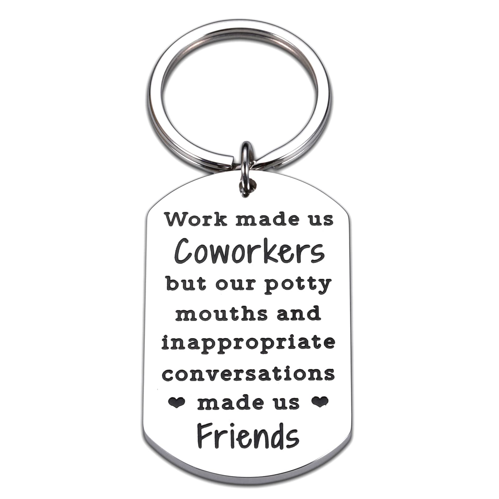 【Coworker Friend Birthday Gifts for Women】: Funny colleague keychain engraved with " Work made us coworkers but our potty mouths and inappropriate conversations made us friends." Perfect office gift ideas for coworker, colleague, employee, employer, boss, leader, mentor, tutor, manager, supervisor, team member, coach, teacher, assistant, staff, best friend, work bestie. A nice friendship gift to show your appreciation for colleagues to friends, female male coworker, work friends, work partner.
