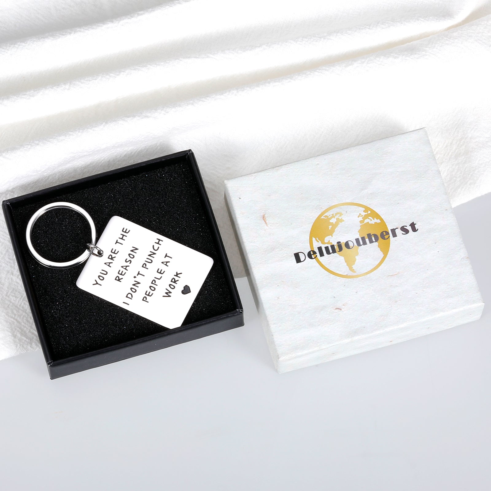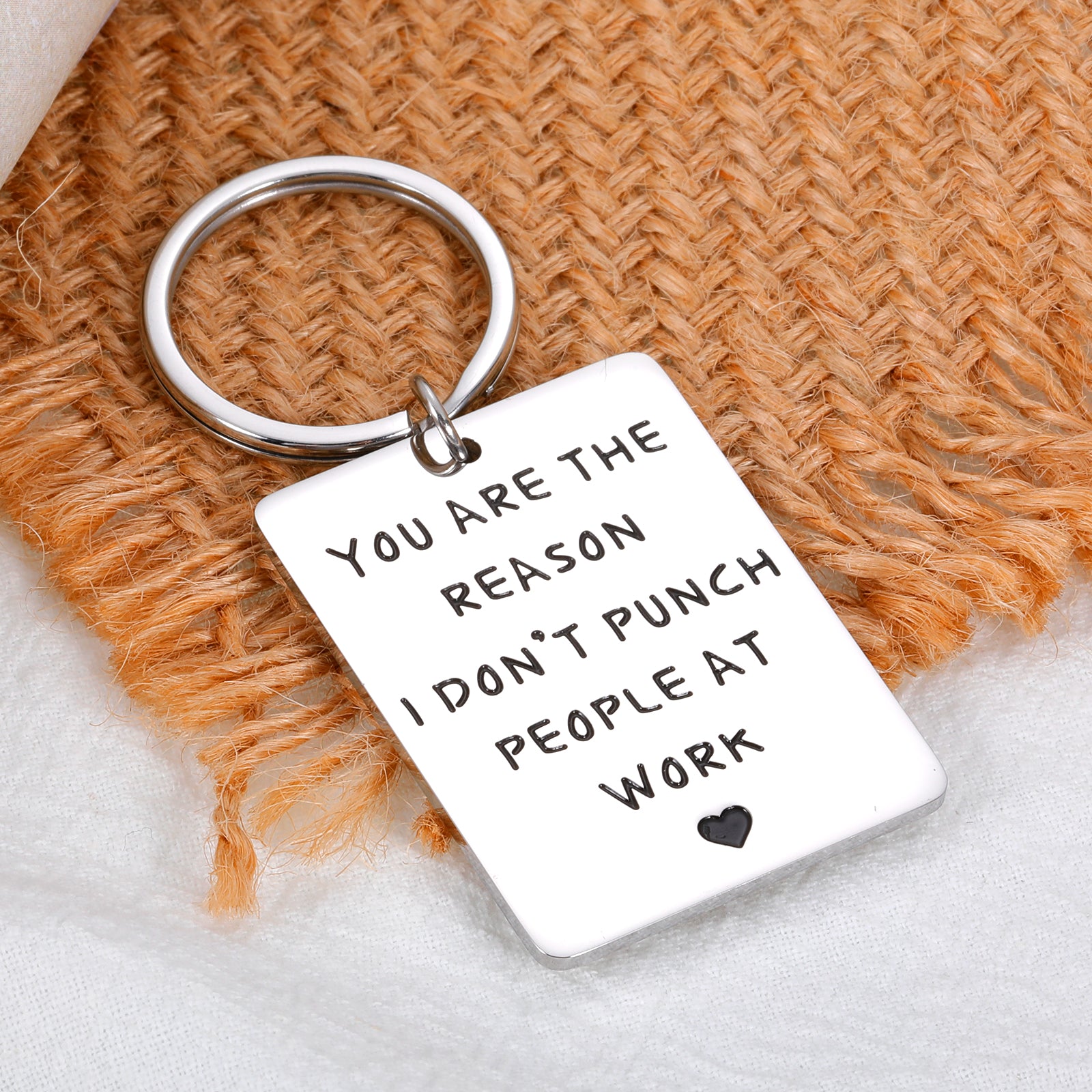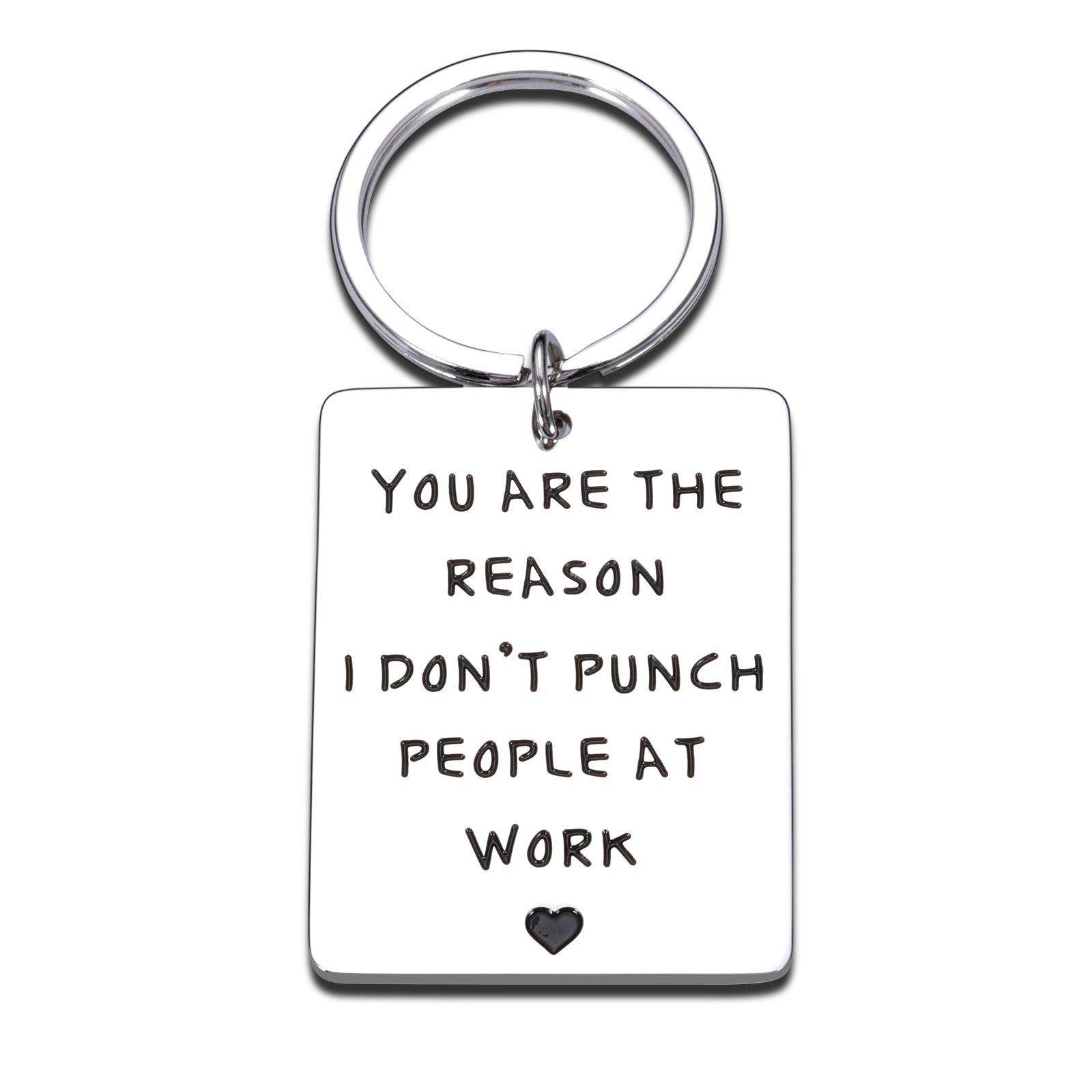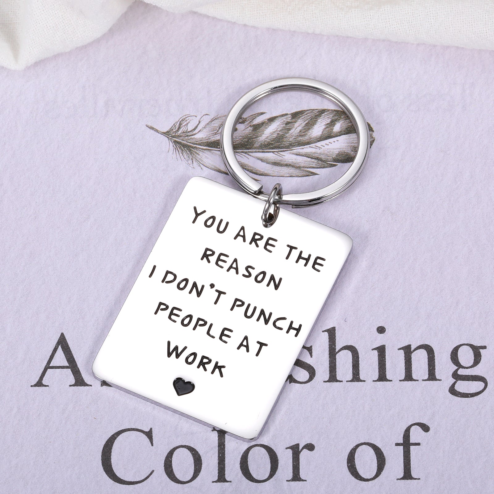 - 【Coworker Goodbye Gifts for Women Men】-- "You are the reason I don't punch people at work." A funny keychain gift idea to your boss, coworker, employee, colleague, manager, supervisor, leader, mentor, business partner, work bestie, office friend, office staff, or retired coworker, teacher, team members, team player, coach for coworker leaving, boss farewell, company anniversary, office party, Bosses Day, birthday, Christmas, Valentine's Day, Thanksgiving, New Year, etc.