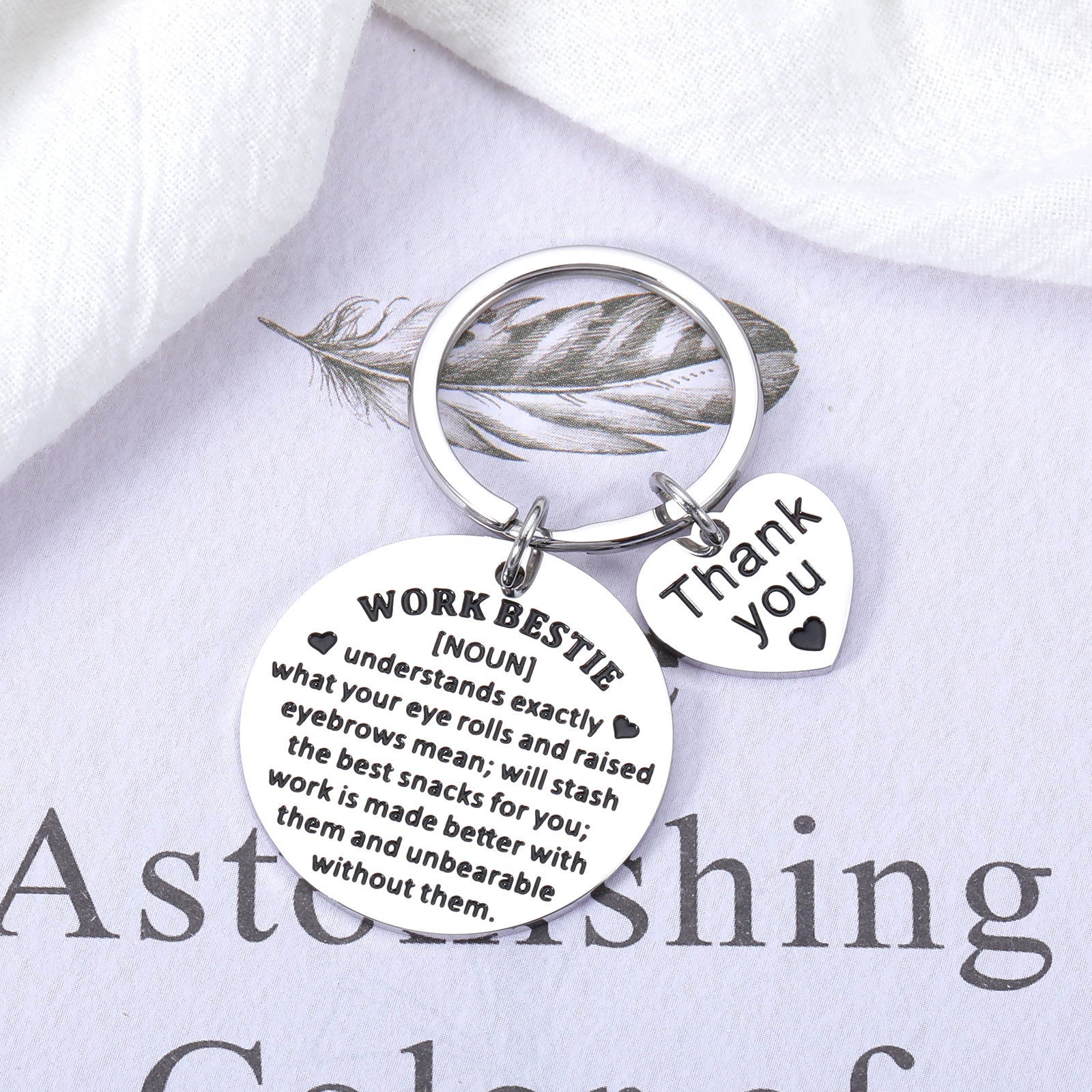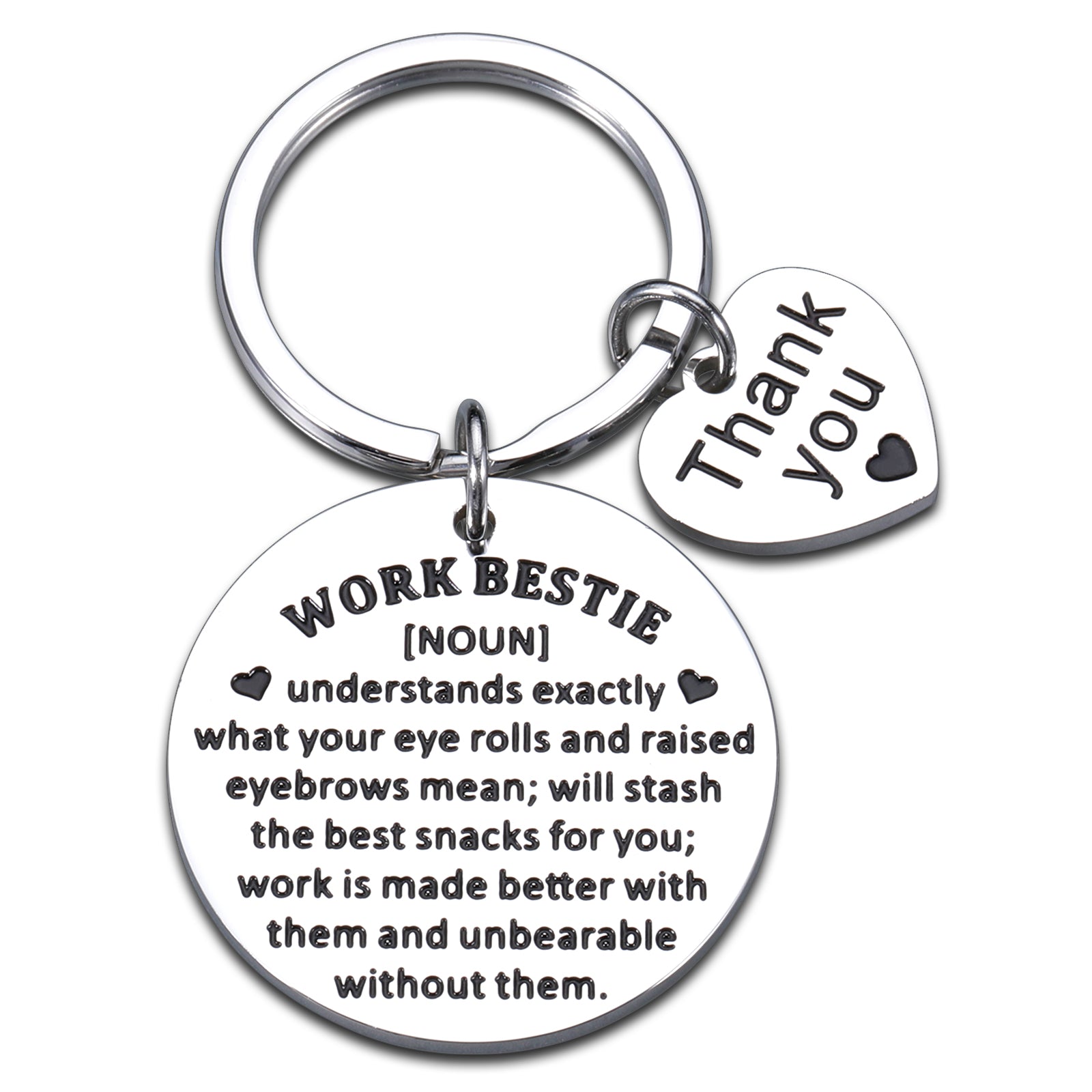 Funny colleague keychain engraved with " work bestie noun understands exactly what your eye rolls and raised eyebrows mean will stash the best snacks for you work is made better with them and unbearable without them". Perfect office gift ideas for coworker, colleague, employees, employer. A nice friendship gift to show your appreciation for colleagues to friends, female male coworker, work friends, work partner.